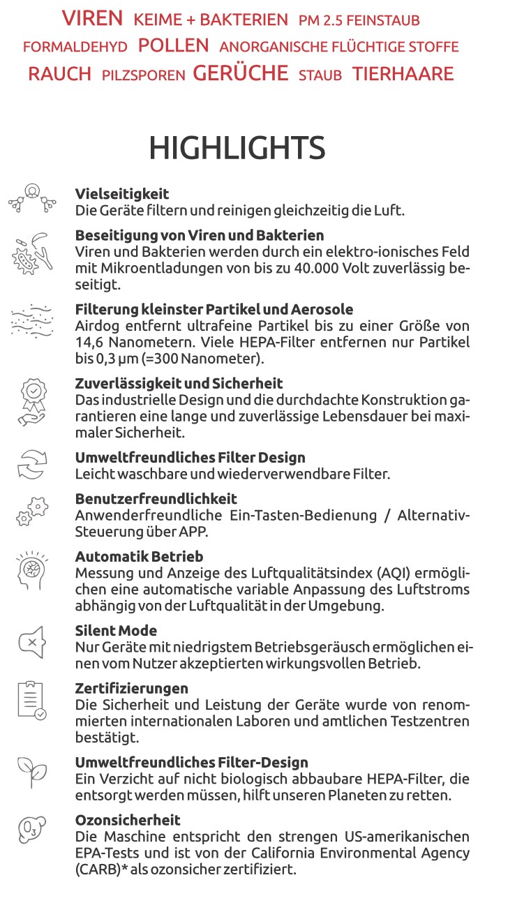 Bis zu 1.386 Kubikmeter Rein-Luft (beim Airdog X8) ermöglicht einen mehrfachen Luftwechsel pro Stunde und reduziert damit signifikant die Ansteckungsgefahr mit verschiedenen Viren.